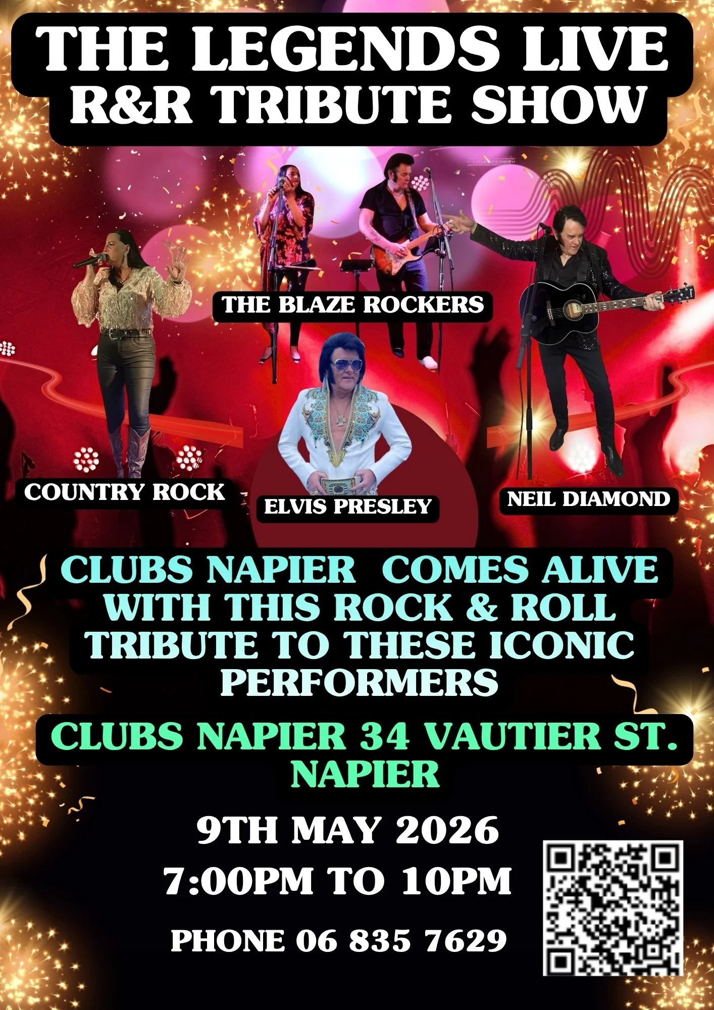 Blaze Rockers bring the spirit of rock & roll roaring back to life with a high-energy tribute to the legends themselves. From the hip-shaking hits of Elvis to the timeless anthems of Neil Diamond, this is a night packed with nostalgia, great music, and unforgettable performances. Grab your friends, hit the dance floor, and get ready to sing along to the classics you know and love—this is one show you won’t want to miss!